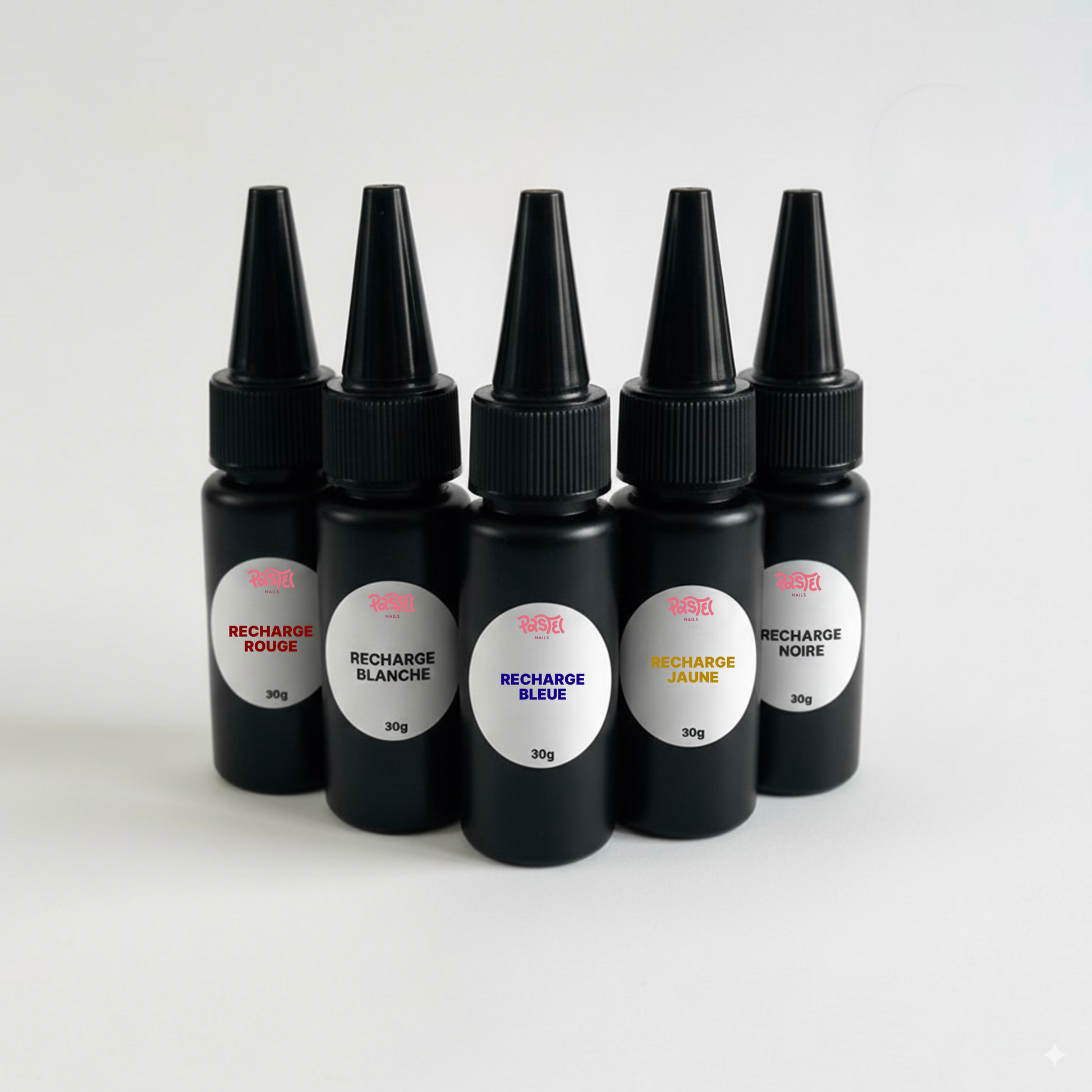 Vous n’avez plus de vernis dans un des tubes de votre kit ? Pas d’inquiétude, voici nos recharges de vernis ! Pratiques et éco-responsables, elles te permettent de prolonger l’expérience Pastel Nails sans racheter un nouveau kit. Disponibles pour chacune de nos 5 couleurs (bleu, rouge, jaune, blanc et noir), elles t’assurent une créativité sans limites tout en respectant l’environnement.